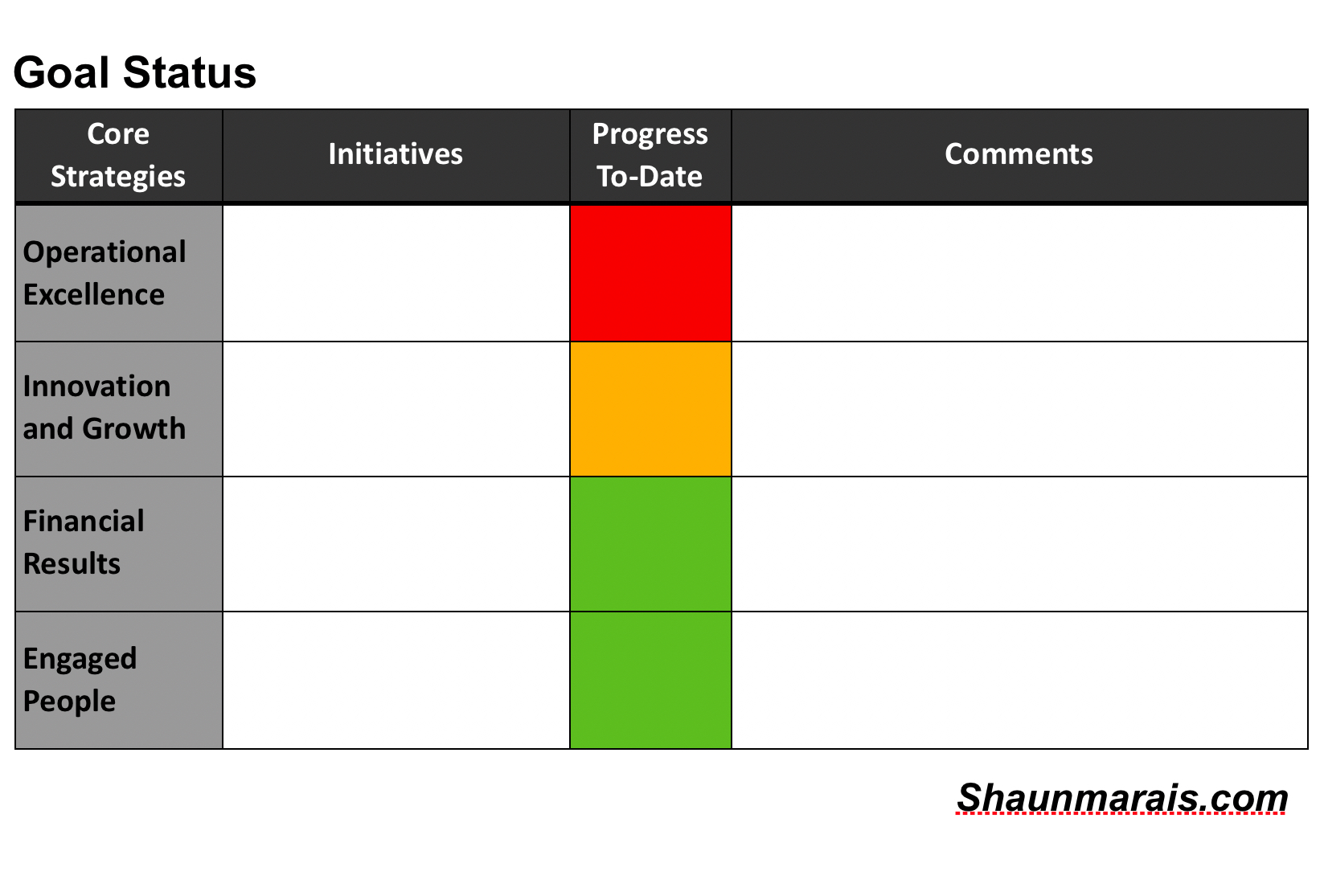- Get a quick overview of the performance of different teams against goals and activities such as operational excellence, innovation, growth, financial results, and employee engagement by reviewing or creating a goal status document.